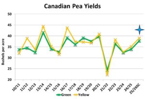 In 2025/26 though, pulse crops avoided the high temperatures of the last few years. Even though rainfall was variable, this year’s moderate temperatures during flowering and filling resulted in much stronger yields, and will likely end up well above StatsCan’s latest estimates. For example, StatsCan reported the Alberta pea yield at 40 bu/acre, while the Alberta Ag crop report showed a yield seven bushels higher, with a similar difference in Saskatchewan estimates. Lentil and chickpea estimates showed the same type of yield response.