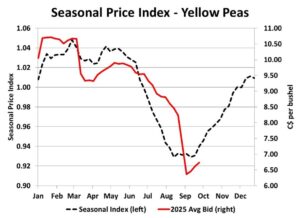 As this year’s pulse harvest progressed and the big yields became obvious to all, getting some of that crop sold took on more urgency. Prices were already declining through the summer but the increase in harvest selling triggered an even sharper downturn. It’s worth noting that this drop still fits the seasonal pattern for this time of year.