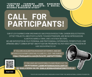 They are seeking participation from farmers and ranchers who can share their experiences, perspectives, and insights on carbon offset or mitigation programs—whether you have taken part in these initiatives or have been affected by them in any way. Your contributions will help improve understanding of how climate-related policies and programs are shaping agricultural practice, and how they are experienced by farming and ranching communities in Alberta.