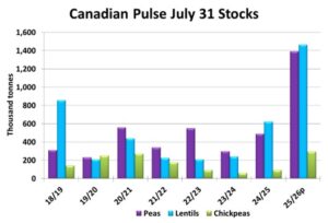 The added element this year is the ongoing risk of trade actions that could cause sharp changes in pulse markets. In the past 12 months, import tariffs were imposed on peas by Canada’s two largest customers with a large impact on prices. More Indian tariffs on lentil imports are possible in the coming months. Of course, reduced or eliminated tariffs are also a possibility, but the odds of that type of positive development are very hard to gauge. In any case, the risks of a large swing in the market could be discouraging traders from issuing new-crop bids.