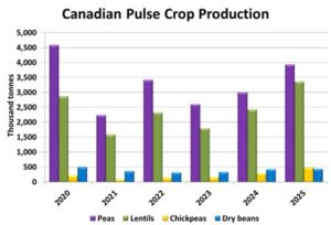 These latest estimates from StatsCan were based on a large farmer survey conducted in November and confirmed the positive harvest results. In fact, they may have understated the actual yields, as they sometimes do. The StatsCan numbers show the total 2025 pulse crop at 8.22 mln tonnes, a jump of more than 2 million tonnes from last year and the largest production since 2016/17. There were differences for each of the pulse crops though.