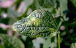 Halo Blight on Dry Bean leaf, Photo Credit: Howard F. Schwartz, Colorado State University, Bugwood.org