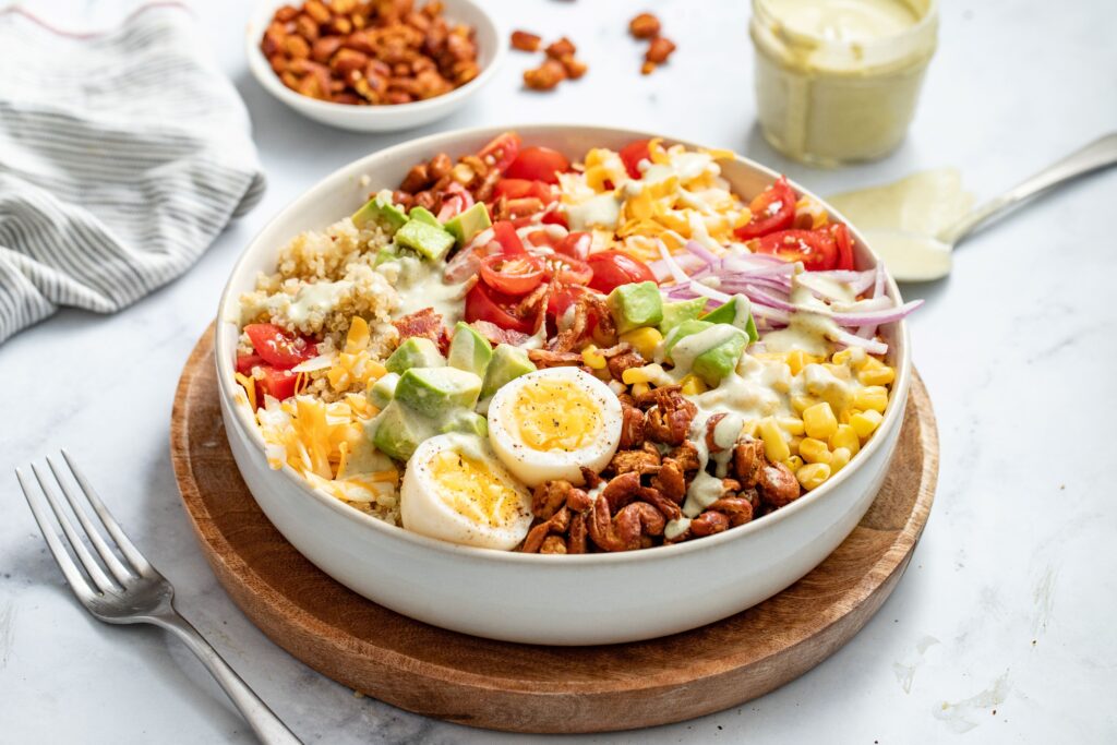 Divide quinoa, tomatoes, onion, corn, bacon, eggs, avocado, and pinto beans between 4 meal-sized bowls. Drizzle with dressing, top with cheese and enjoy! Alternatively, prepare each ingredient and cover in the fridge separately for preparation up to 1 week.