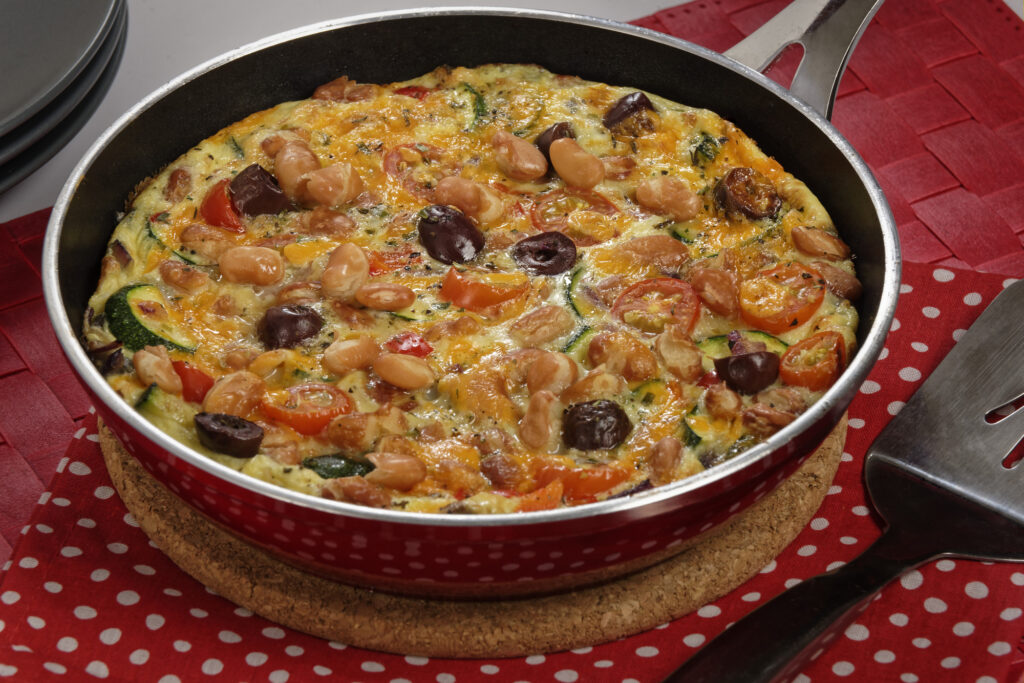 In a bowl, whisk eggs with herbs. Pour over vegetable and bean mixture and allow to set for 1-2 minutes. Evenly sprinkle diced tomatoes, olives and cheese over top.
