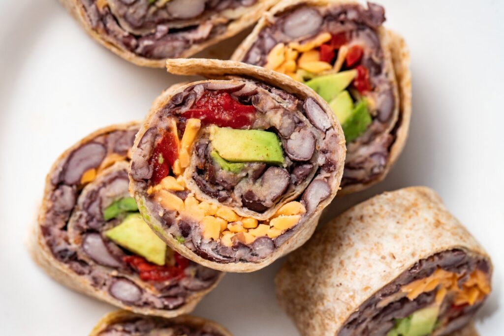 Spread mashed bean mixture evenly over each tortilla. Divide roasted red peppers, avocado, and cheese evenly between each tortilla.