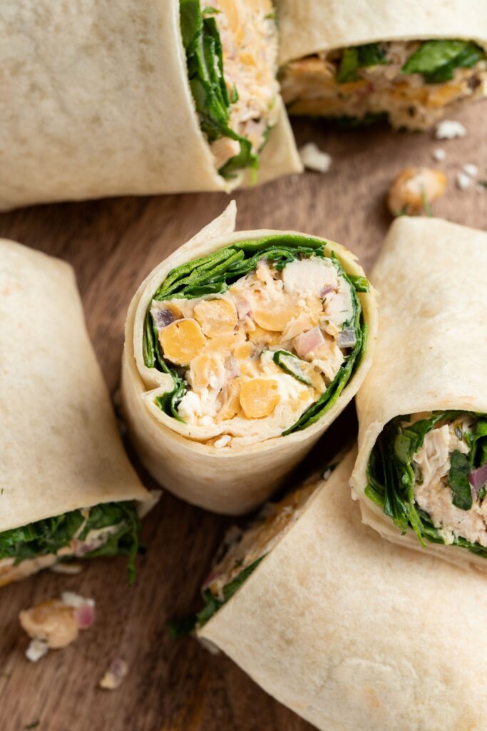Lay tortillas on a flat surface. Place a quarter of the spinach in the center of each tortilla, followed by the warm chicken salad mixture, and feta. Fold the sides of the tortilla in and roll tightly to close.