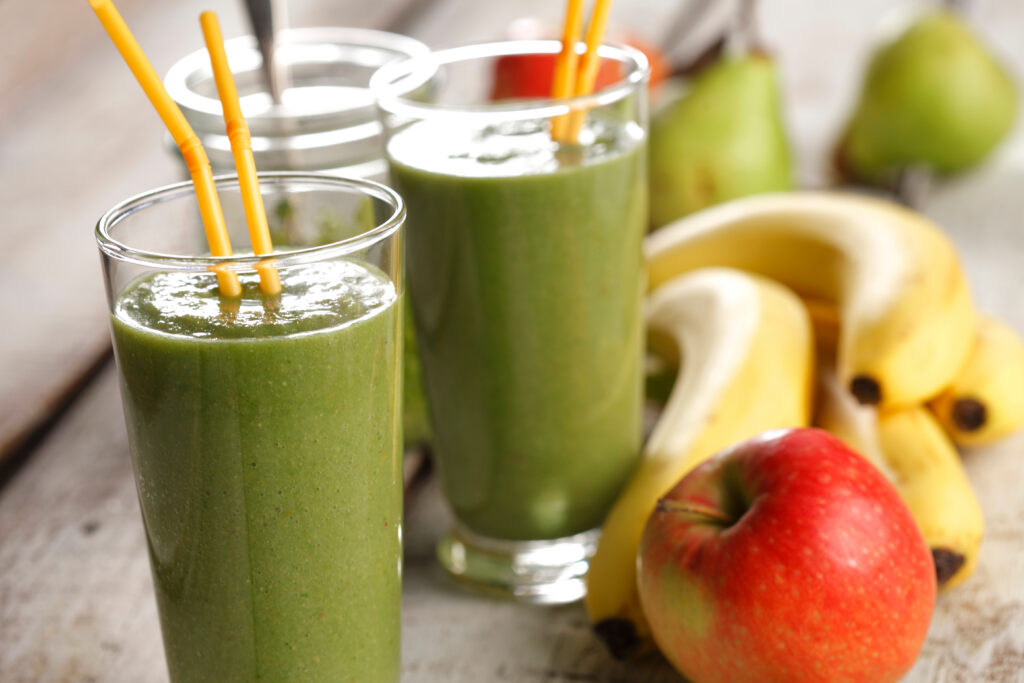 Gradually add cubed apple, pear and banana and continue to blend until totally mixed. Pour into serving glass.