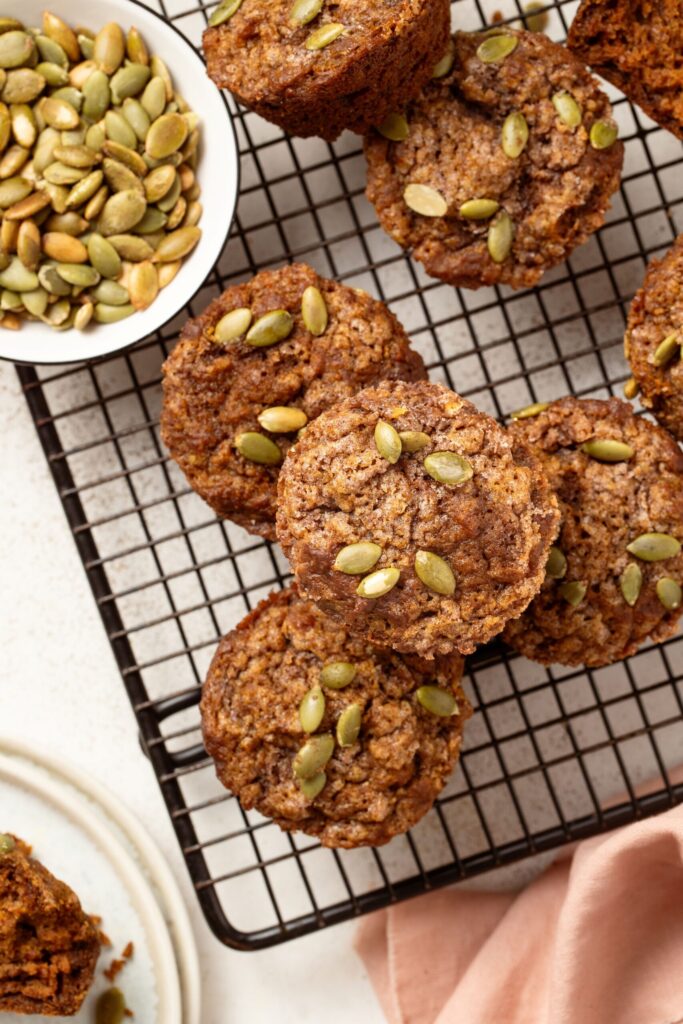 Scoop batter into muffin cups to about three quarters full. Sprinkle streusel evenly over all the muffins. Sprinkle pumpkin seeds on top of each muffin, if desired.