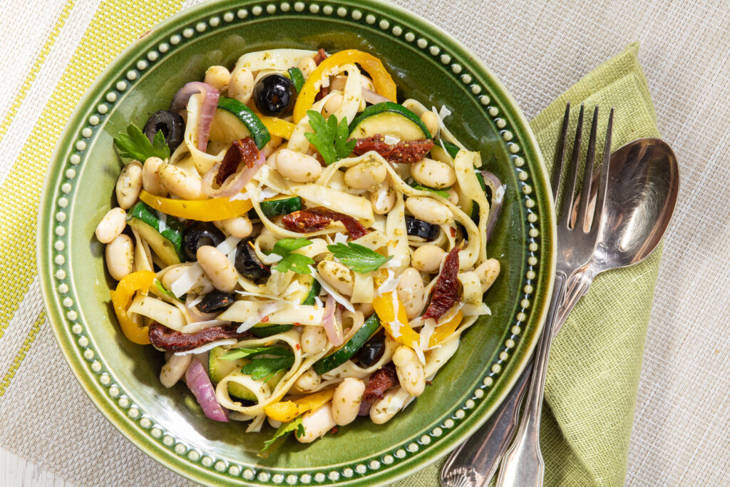 In a deep saucepan, gently heat olive oil over medium. Add shallots and pepper and stir fry for about 2 minutes. Add zucchini and cook an additional minute. Stir in sundried tomatoes and olives.