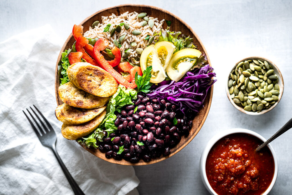Assemble power bowls by dividing rice, beans, plantain and vegetables between 4 bowls. Drizzle with prepared Pepper Sauce and enjoy!