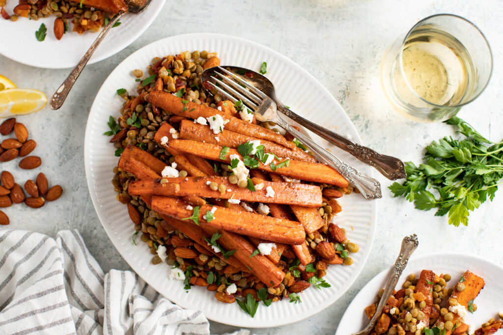 To serve, spread lentil mixture across a large plate or shallow bowl. Squeeze lemon juice over the lentil mixture then arrange roasted carrots on top. Just before serving, sprinkle with chopped parsley and crumbled feta.
