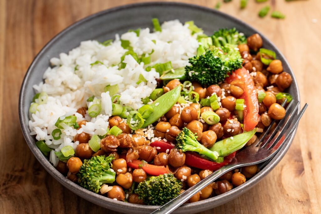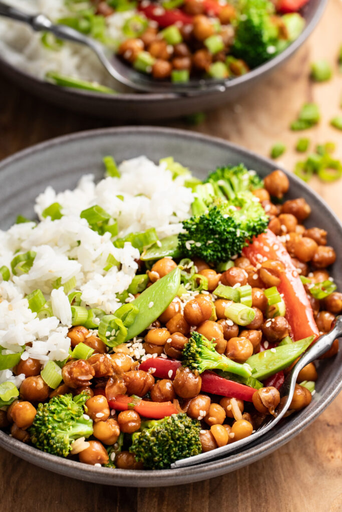 Divide rice between four bowls and top with teriyaki chickpeas and veggies. Sprinkle with sesame seeds and green onion, if desired.