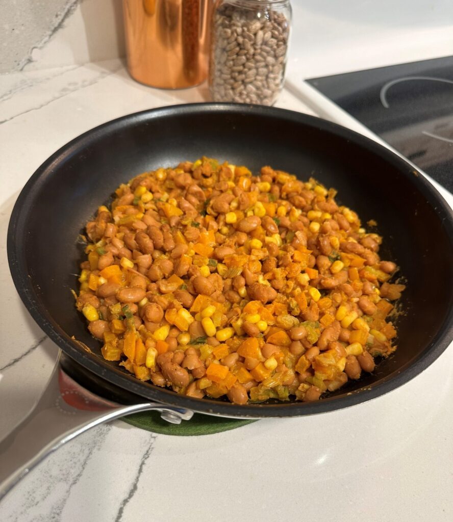 Add pinto beans and corn and stir fry for a few more minutes.