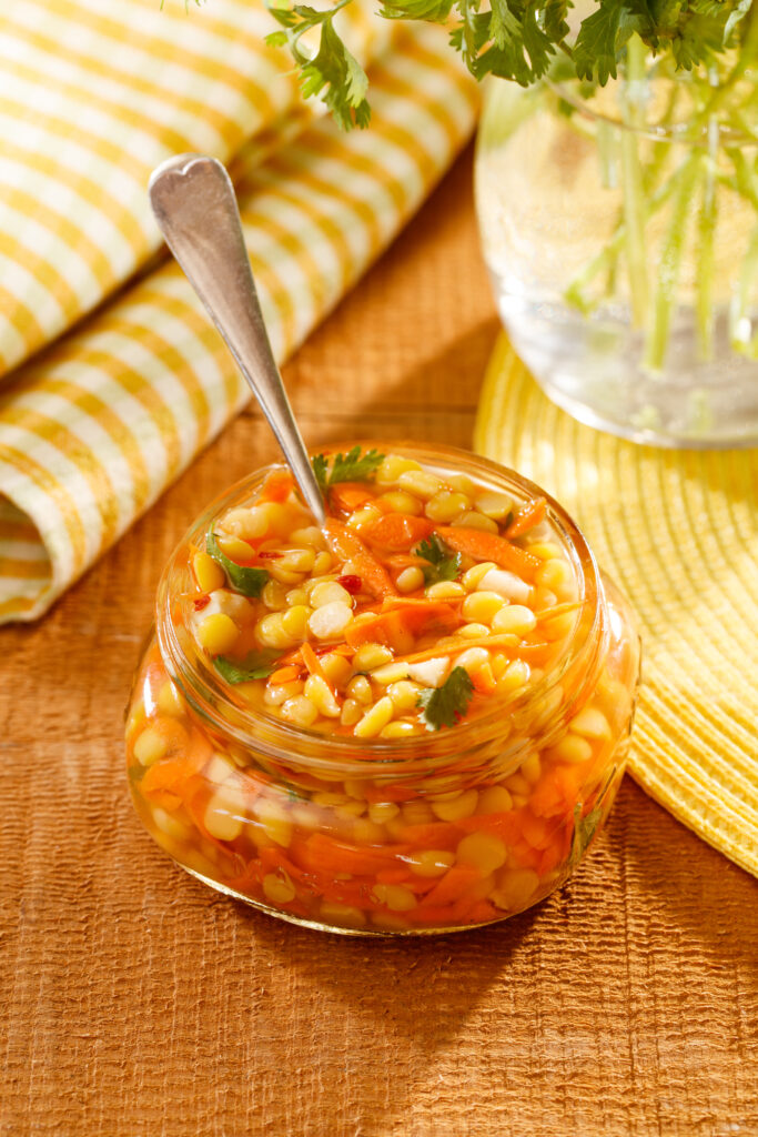 Spoon pea mixture into 2 - 2 cup (500 mL) mason jars. Pour vinegar mixture over peas in the jars and gently stir to combine. Cover with the jar lids.