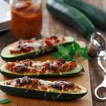 Slice zucchini in half lengthwise and remove seeds. Place on cookie sheet.