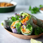 These amazingly fast and easy rice paper salad rolls with garlic-peanut sauce are full of fresh veggies and filling lentils that you can take with you anywhere!