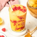To serve, pour the raspberry puree in a glass. Fill the remainder of the glass with the smoothie and stir to incorporate. Enjoy!