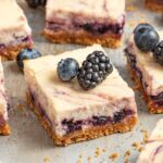 Pour the cheesecake filling over prepared crust. Spoon dollops of jam on top and use a knife/toothpick to swirl. It will slightly sink to form a middle layer. You can also have extra jam on hand to top the squares for serving.