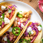 Build the tacos! Heat tortillas in a shallow frying pan or wrap in a paper towel and microwave until soft and warm. Assemble tacos with seasoned beans, pickled onions and avocado crema. Top with goat cheese and chopped cilantro. Enjoy!